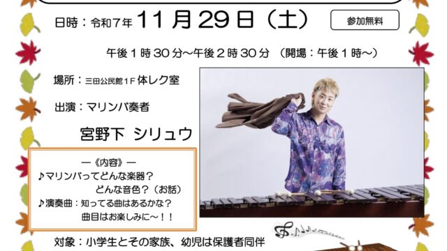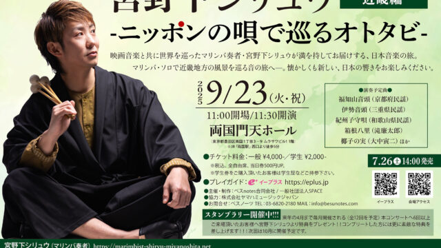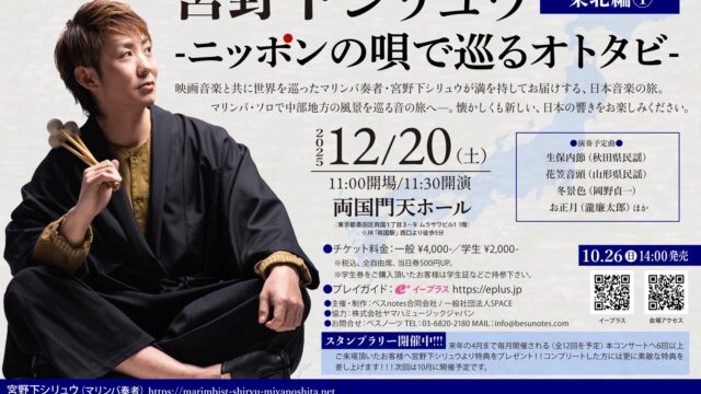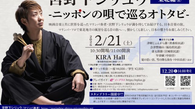 コンサート詳細2024年、映画音音楽と共に世界を旅してきたマリンバ奏者宮野下シリュウが送るニッポンの唄の新解釈と普及をテーマにしたオトタビ、12月公演のお知らせです!2月公演は東北編其のニ!!日時2026年2月21日(土)10:30開場 /...